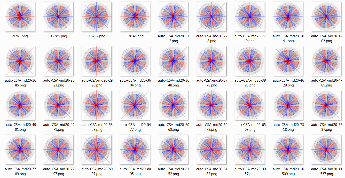 Computed trajectories within and between classes distributed in a 2D concept space that are statistically indistinguishable, plotted by angle. Each pixel that extends further than the first grey circle indicates one more trajectory for that angle